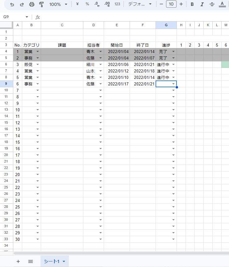 今回は、下のようなスプレッドシートファイルのA3:G9の範囲を参照してみます。